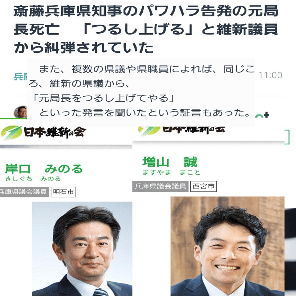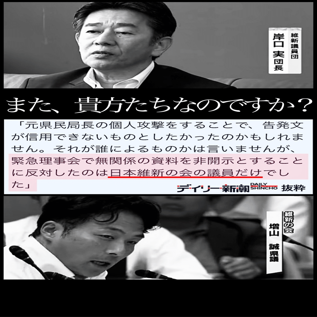 渡瀬局長のスマホに最後に電話をかけて「おまえの不倫の話を百条委員会で全部バラしたるからな!ケケケ!」と、自殺に追い込んだ決定打を打ったのが、維新の県会議員「増山誠」。ダンプに轢かれてミンチになればいいのに。
