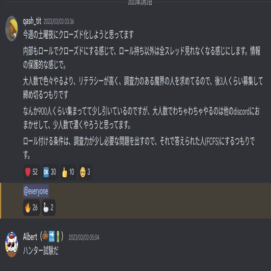 ハンター試験(Closedチャンネルにアクセスできる人を選抜する試験)をQASH鯖にて開催しました。Web3Alertsの精査をしていたスレッドなどはクローズド化、雑談のみオープンにしています。