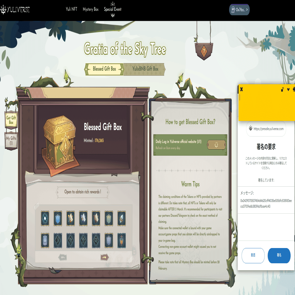 そもそもYuliverseが何なのかもよく知らないですし、この箱が何に役に立つのかもそこまで理解していないのですが、箱需要がとんでもなく高い割 に、1ウォレットが1日1個までしかMintできない、という状態でした。