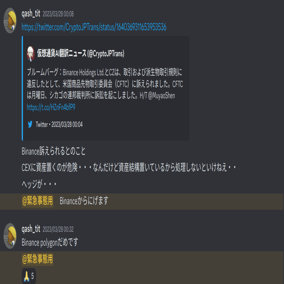 QASH鯖やKudasaiにて逃げたことを表明、FUDと取られかねない避難訓練状態だったのと、まさかUSDCが・・・という思いがあったので@everyoneなどはせずに控えめに通知。これで逃げれた人もいたらしい。
