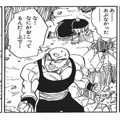 天津飯はもう一撃をくらい瀕死の状態となるが、助けようとしたクリリンはエネルギー弾によって足止めされ、近づくことすらできない。