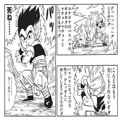 また、その前のゴテンクスの変身が解ける描写では、まず超サイヤ人3が解けてノーマルに戻った後、その数分後にゴテンクス状態が解けていた。