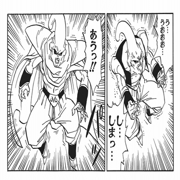 悟飯がポタラを落としてしまい、もたついている間に悟空を始末しようとする場面だ。悟空に攻撃を仕掛ける瞬間、ブウは不自然に動きを止めている。