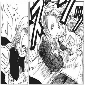 さて、まずは18号について。ベジータは人造人間たちに戦いを仕掛け、18号と1対1で戦う。当初はお互いに「てんで本気じゃない」状態だったがその後は本気で戦うこととなる。