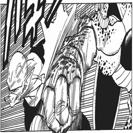 セルは突進するピッコロに平手を見舞うがあっけなく躱され、背後からキック、さらにもう一発キックでふっ飛ばされる。