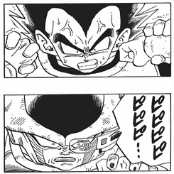 また、この時のベジータは血管を浮き上がらせ本気だが、フリーザは冷静そのものだった。