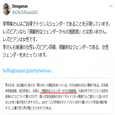 そもそもこのOmegamanは何をもって「レズビアンなら「規範的なジェンダーからの逸脱者」とは言いません」と断言できるのか、はなはだ理解に苦しむところです。このおっさんのアイコンの人自身がレズビアンなのかな?