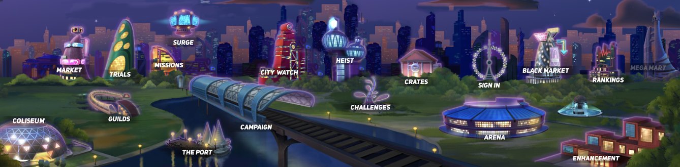 | Trials | A mode where players can compete on a series of battles using a limited amount of heroes divided by three separate teams, in order to obtain the most valuable badge bits. Players can access these parts of the city five a day, but only one out of the three is open in certain days of the week. Additionally, Trials offer their own in-game modes.