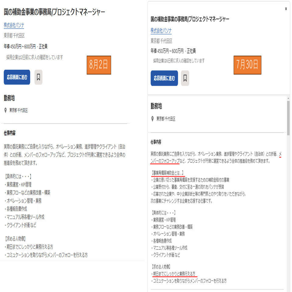 PMの求人広告を最初に見つけたときと少し変わっているようなので、比較してみますと、あれれ?【事業再構築補助金とは..】の項目が消えている。