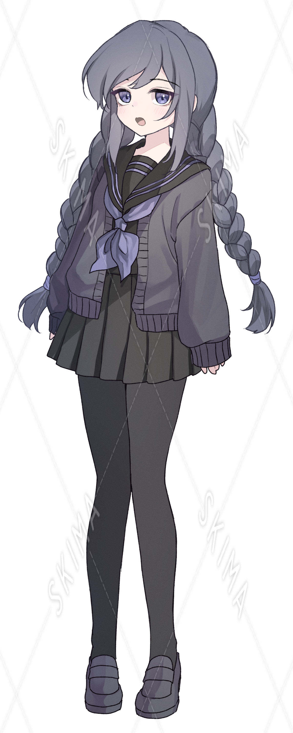 くすんだ青色、三つ編みとセーラー服の女の子です。キャラ設定はご自由に。