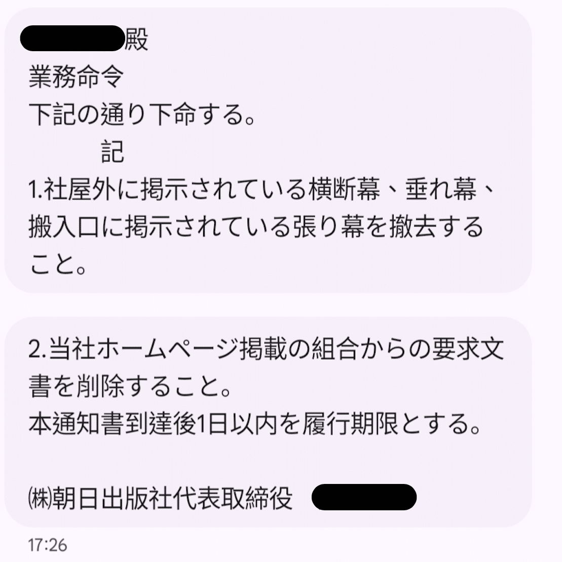 私たちが作った横断幕、垂れ幕、張り幕の撤去などが「業務命令」として書かれています。突然、私用の携帯電話に届いたこのメッセージは怪文書なのか、それとも……?