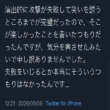 (相手選手を煽って技をかけようとして失敗するという、その一連の流れが上手くいったという内容がバカにしてると誤解されたのではないか)その後、独り言としてブロック行為への見解をツイート