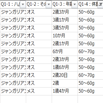 まずは飼っている(いた)ハム様に関して、種類(Q1-1)、性別(Q1-2)、年齢(Q1-3)、体重(Q1-4)を聞いてみました。
