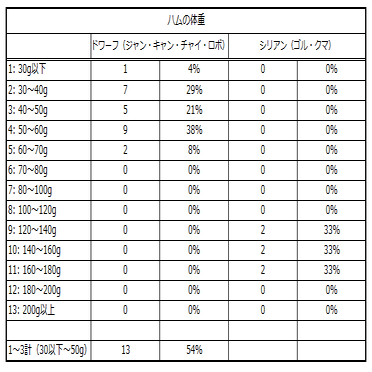 ハム様の体重については、シリアンとドワーフでは体格差があるため、それぞれの種類に分けて集計しました。