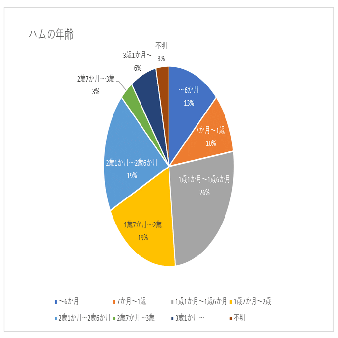 今回、調査項目に体重や年齢を入れたのには、体重と健康年齢(寿命)とに関連があるのか、ハムスターにダイエットは必要か確かめてみたいというのもありました。もし平均を大きく上回る体重で年齢が1歳未満の子ばかりだったら肥満の影響も少しは疑われますが、今回の結果を見る限りでは2歳以上の子も多いだけでなく、3歳を超える子もいるので、ぽっちゃり体型が必ずしも不健康や短命に結びつくものとはいえないように思います。そして、健康な子なら多少太めでもダイエットしなくてもよいのでは? とも思います。