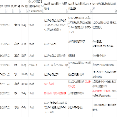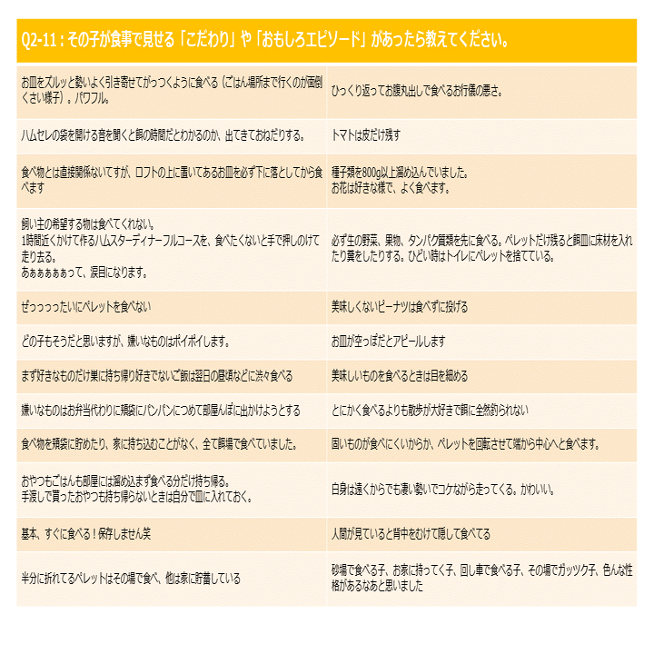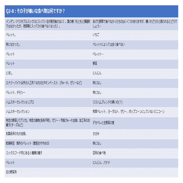 嫌いなものリストには予想どおり、ずらりと「ペレット」の文字が並んでいますが、みんなペレットが嫌いというわけではなく、わずかながらペレットを好んで食べる子もいるようです(表8)。ちなみにペレット好きの子が何のペレットを食べているのか参照してみたところ、「ひかりハムハム」でした。
