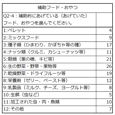 1位は生の野菜・野草・果物等、2位は穀類、3位は乾燥野菜・ドライフルーツということで、補助フードでは野菜や果物が多く選ばれています。