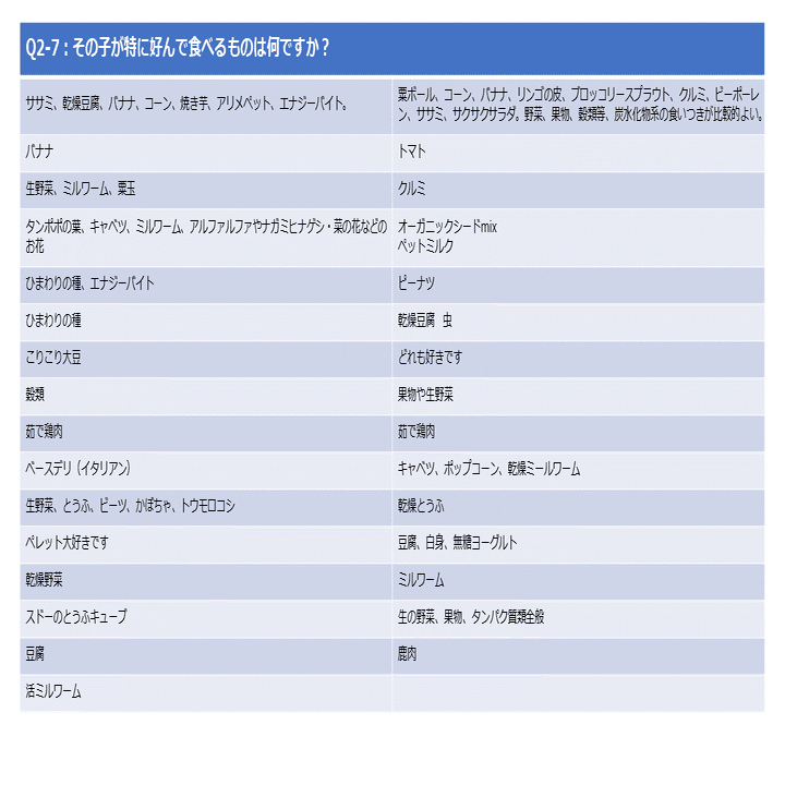 好きなものは野菜、種子、動物性たんぱく質が多いようです。野菜に関してはあまり細かくどの種類かまでは書かれていないことから、野菜ほぼ全般が好みなのかと思われますが……
