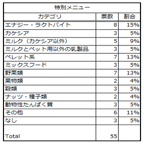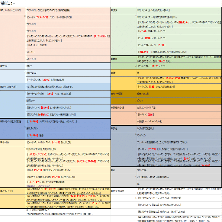 なお、表14で「ミルク(カケシア以外)」としたのは、カケシアをミルクの一種と捉える人もいるためです。原材料を見るとミルクというよりはエナジーバイト等の総合栄養剤なのかなと思いますが、乳成分が多い(原材料の2番目にある)のでミルクや乳製品に含めるかどうかは判断に迷います。エナジーバイトは穀類主体の栄養剤、カケシアは乳主体の栄養剤といったところでしょうか?