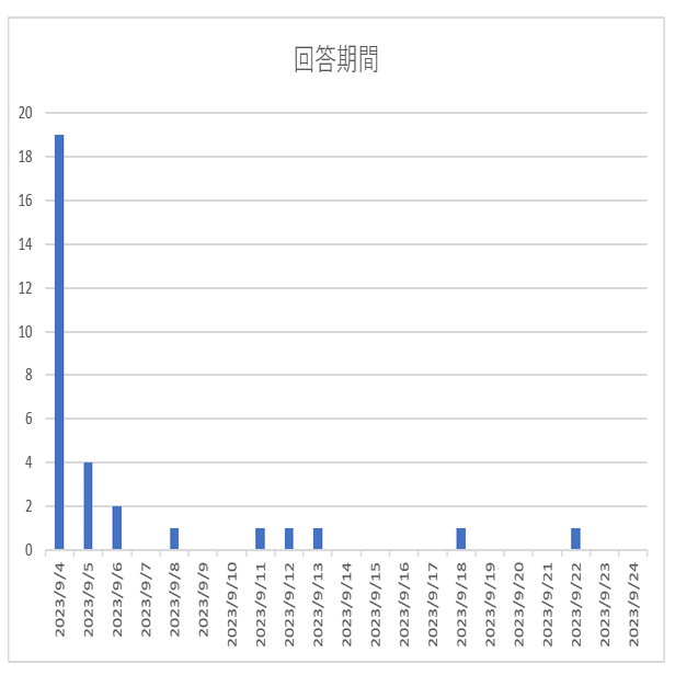 アンケート募集期間は2023年9月4日~2023年9月24日としていましたが、20日間の回答期間の結果は、初日の回答数が19と圧倒的でした。次点で翌日の9月5日(回答数=4)、その次で翌々日の9月6日(回答数=2)と続きました。