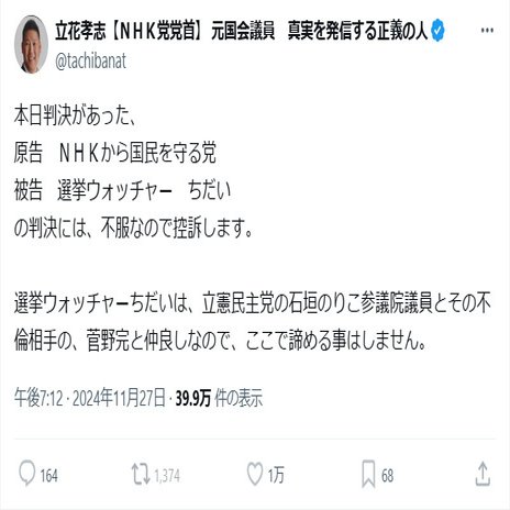 ■ 立花孝志が控訴をする方針