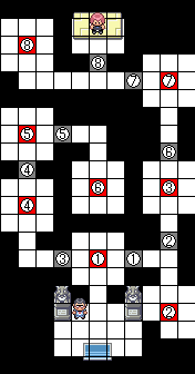 Here is a detailed map of the interior of the Gym. The trainers are in red. All trainers need to be defeated to reach Fenton. Gray squares can be passed by defeating the corresponding trainer.
