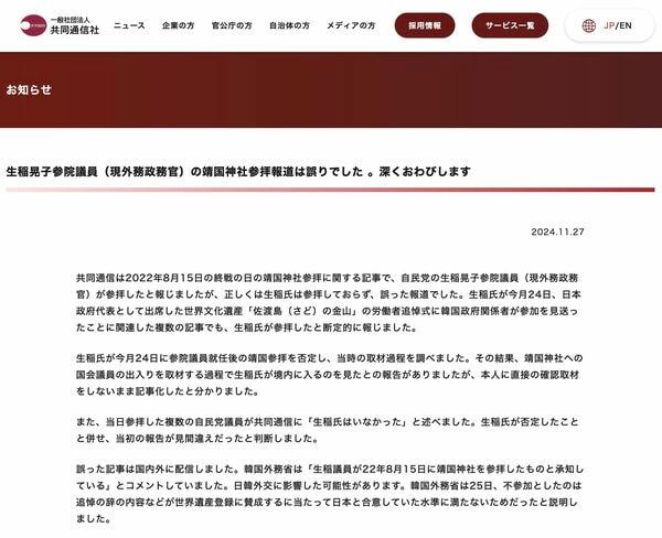 誤報となった2022年8月15日の配信は、当時の閣僚らが靖国神社を参拝したことを伝える記事。配信を受けた加盟紙は翌16日の朝刊や電子版で、それぞれ「2閣僚が靖国参拝 首相は私費で玉串料奉納 終戦の日」(東奥日報=青森県)、「高市氏と秋葉氏、靖国参拝 首相は私費で玉串料 中韓反発」(信濃毎日新聞=長野県)といった見出しをつけ、一斉に報道した。