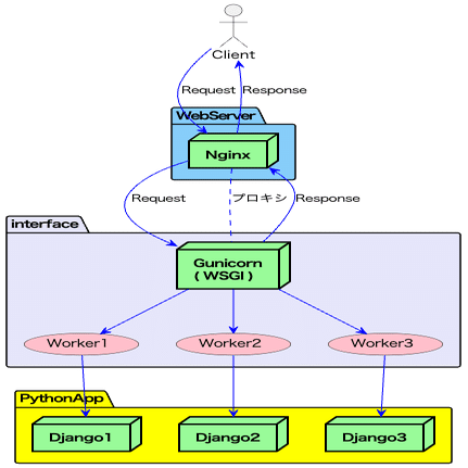 WSGIサーバ(例:Gunicorn): Pythonアプリケーションを実行し、WSGI仕様に従ってWebサーバとアプリケーション間の通信を処理します。