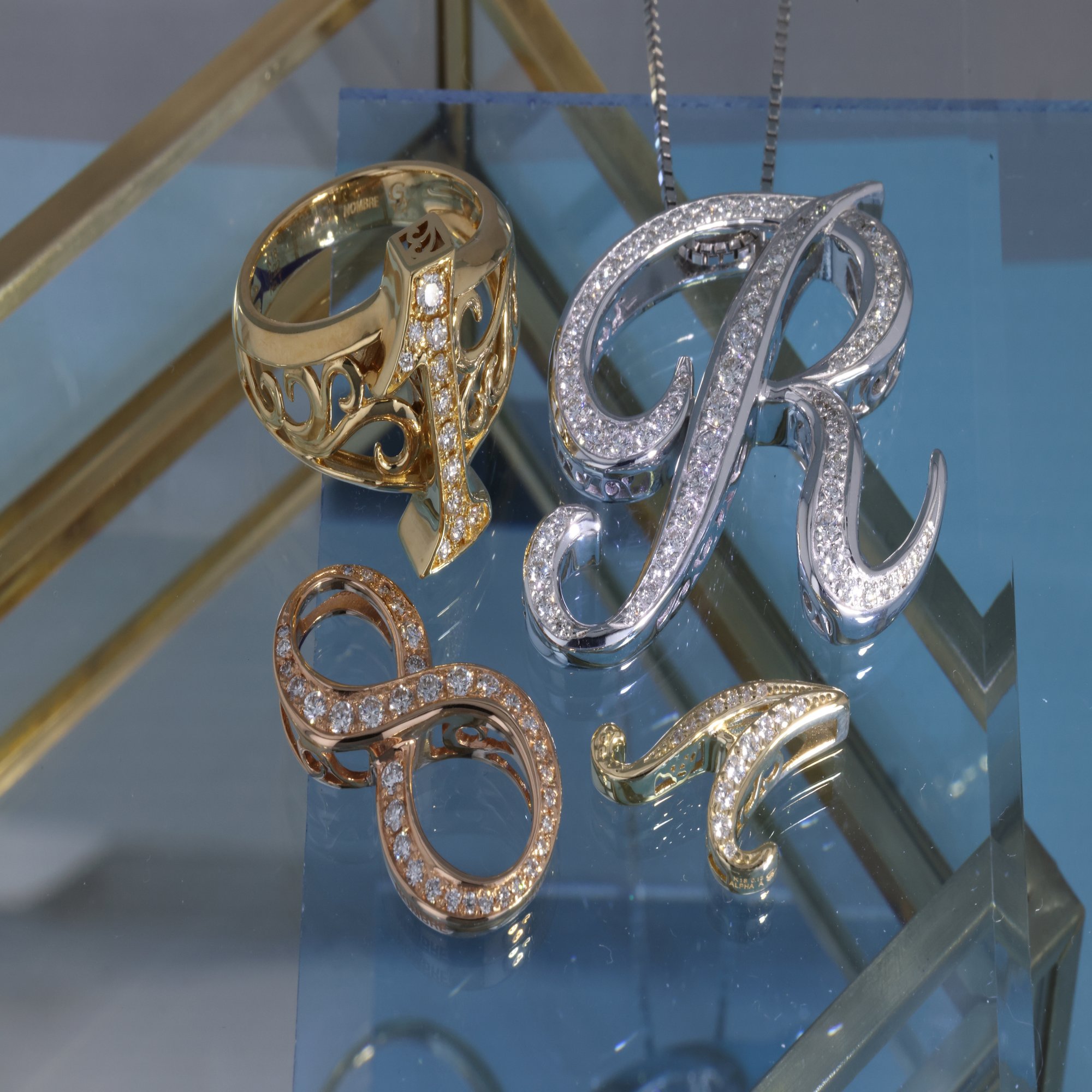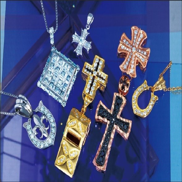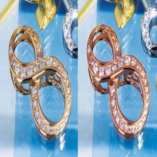 それぞれのジュエリーを加工して全体の明るさ・コントラストを調整しました。最初の画像に比べると、明るくそれぞれのゴールドの色味・ダイヤモンドの輝きも増してきました。