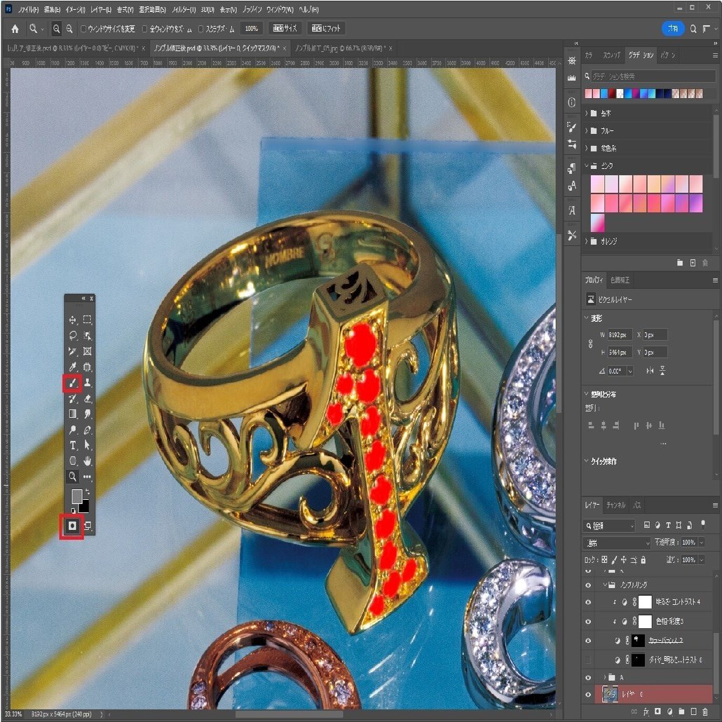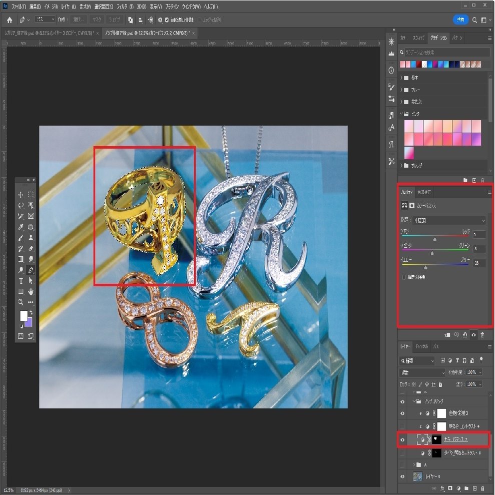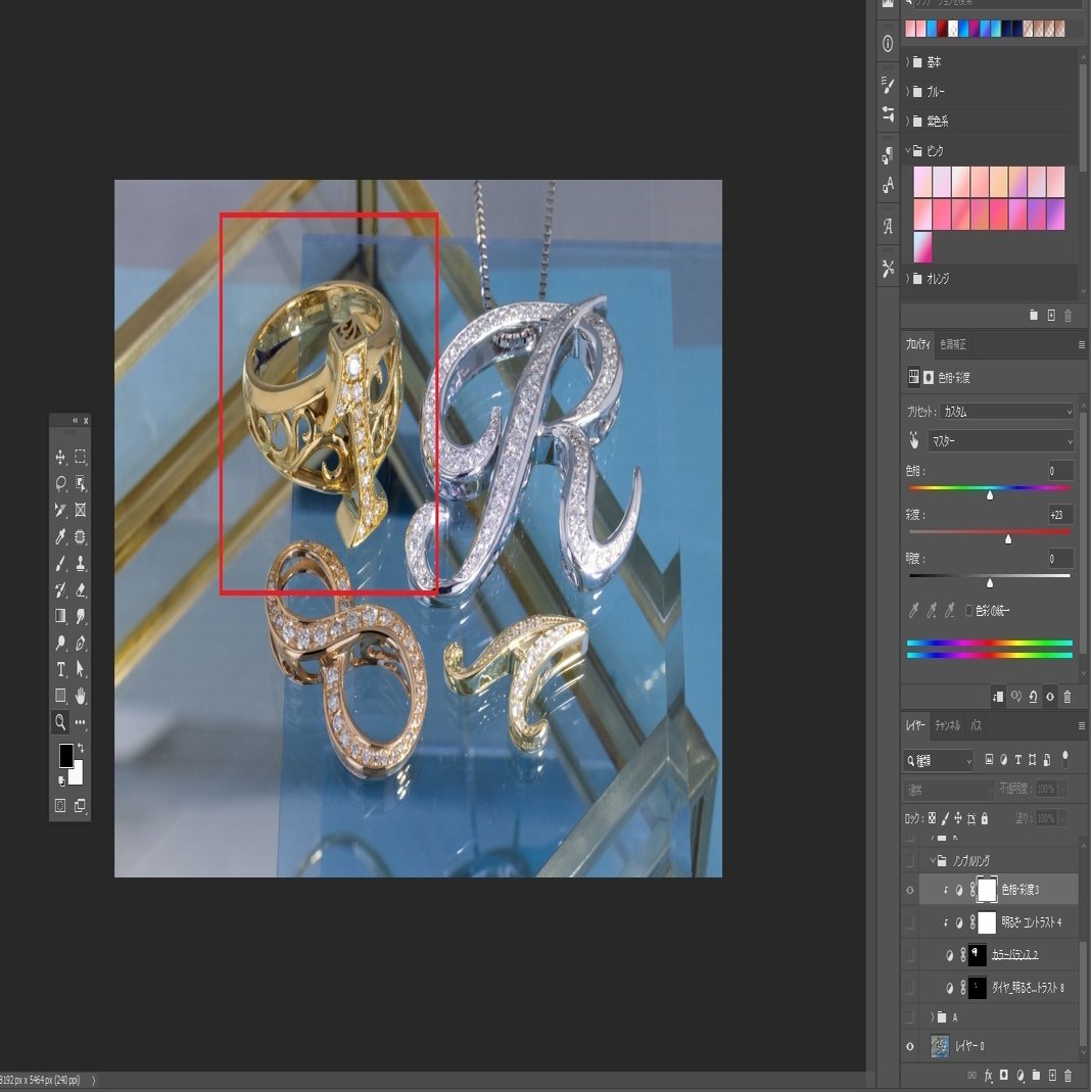 これにより、地金の部分だけを、少し赤みのあるイエローゴールドの色味に編集する事ができました。