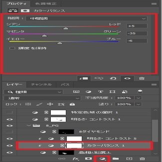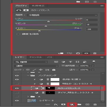 さらに色味を調整するため、前回同様「レイヤーパネル」から下の「塗りつぶしまたは調整レイヤーを新規作成」ボタンをクリック「色相・彩度」を選択→「カラーバランス」レイヤーで選択した部分のみに適用できる形にします。(Altを押しながら、レイヤーとレイヤーの間をクリックすると下のレイヤにのみ適用できる形になります。