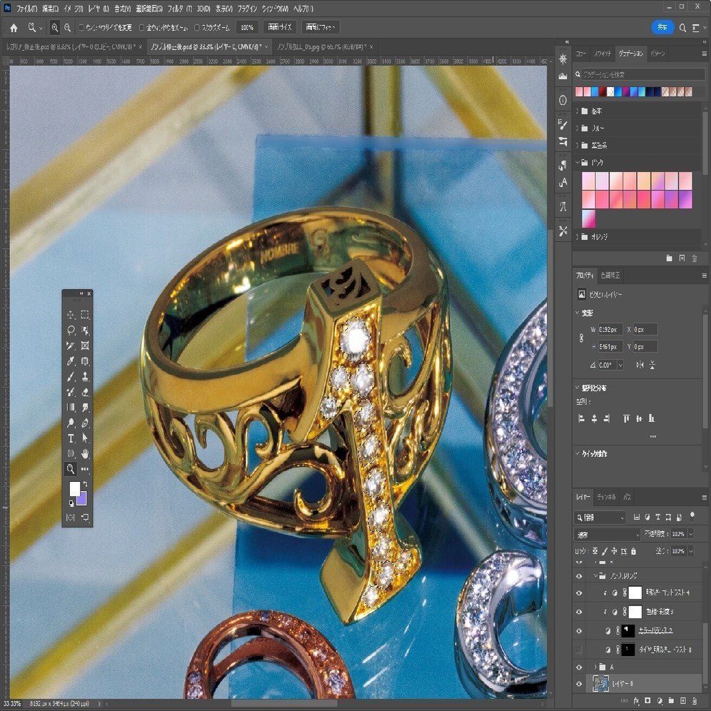 ダイヤモンドだけを選択したり、イエローゴールドの地金の部分だけを選択したりと部分的に選択するため、少し面倒な作業も発生しますが、1つ1つ丁寧に作業する事で美しい画像を作成する事ができます。