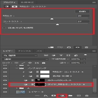 「レイヤーパネル」から下の「塗りつぶしまたは調整レイヤーを新規作成」ボタンをクリック「明るさ・コントラスト」を選択