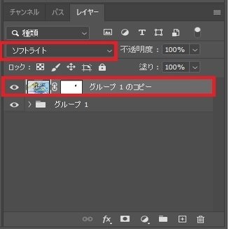 レイヤモードを「ソフトライト」に設定します。