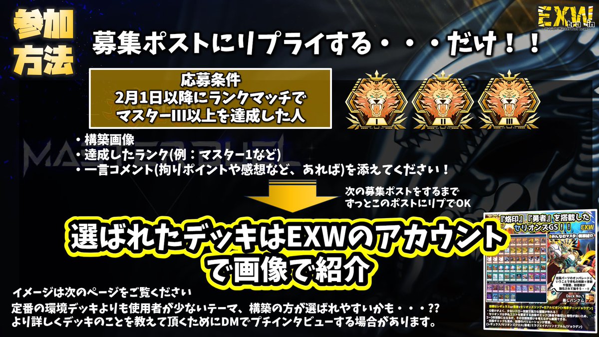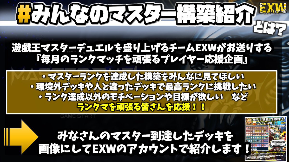 【新企画】ランクマッチを応援! 『みんなのマスター構築紹介』 #遊戯王マスターデュエル 皆さんが2月マスターランクに到達したデッキをリプライで教えてください! 画像で紹介させて頂きます! ・2月にマスター3以上到達した構築画像 ・到達ランク ・一言コメントを添えて #みんなのマスター構築紹介 pic.twitter.com/3gjrTO7suo