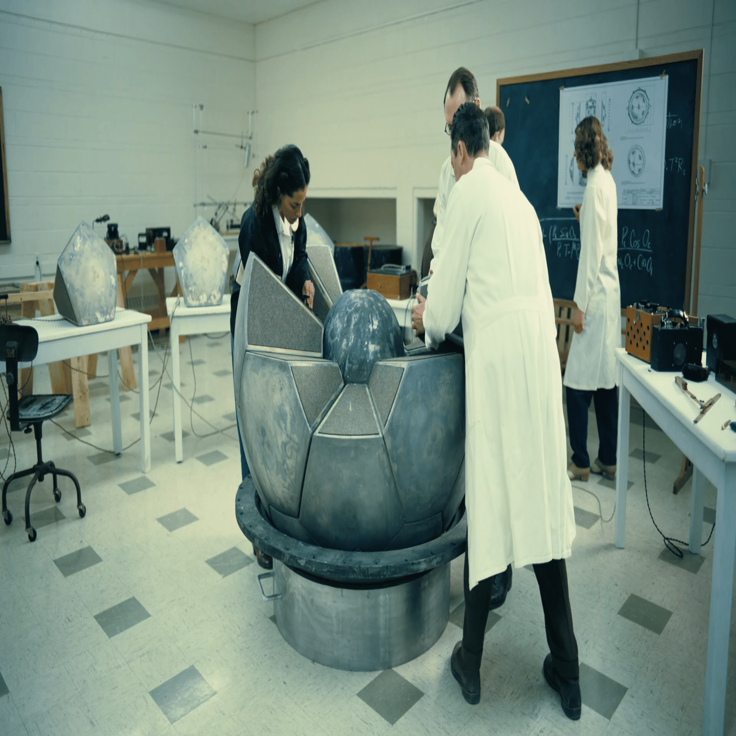 7月16日未明。急ピッチの突貫工事や悪天候で不安は残りつつも、大統領報告期限日の午前5時30分に強行してトリニティ実験は成功する。スタッフは全員徹夜続きで疲労困憊で、理論上ニアゼロとはいえ連鎖反応による大気炎上が起きる可能性もあり滅茶苦茶であった。