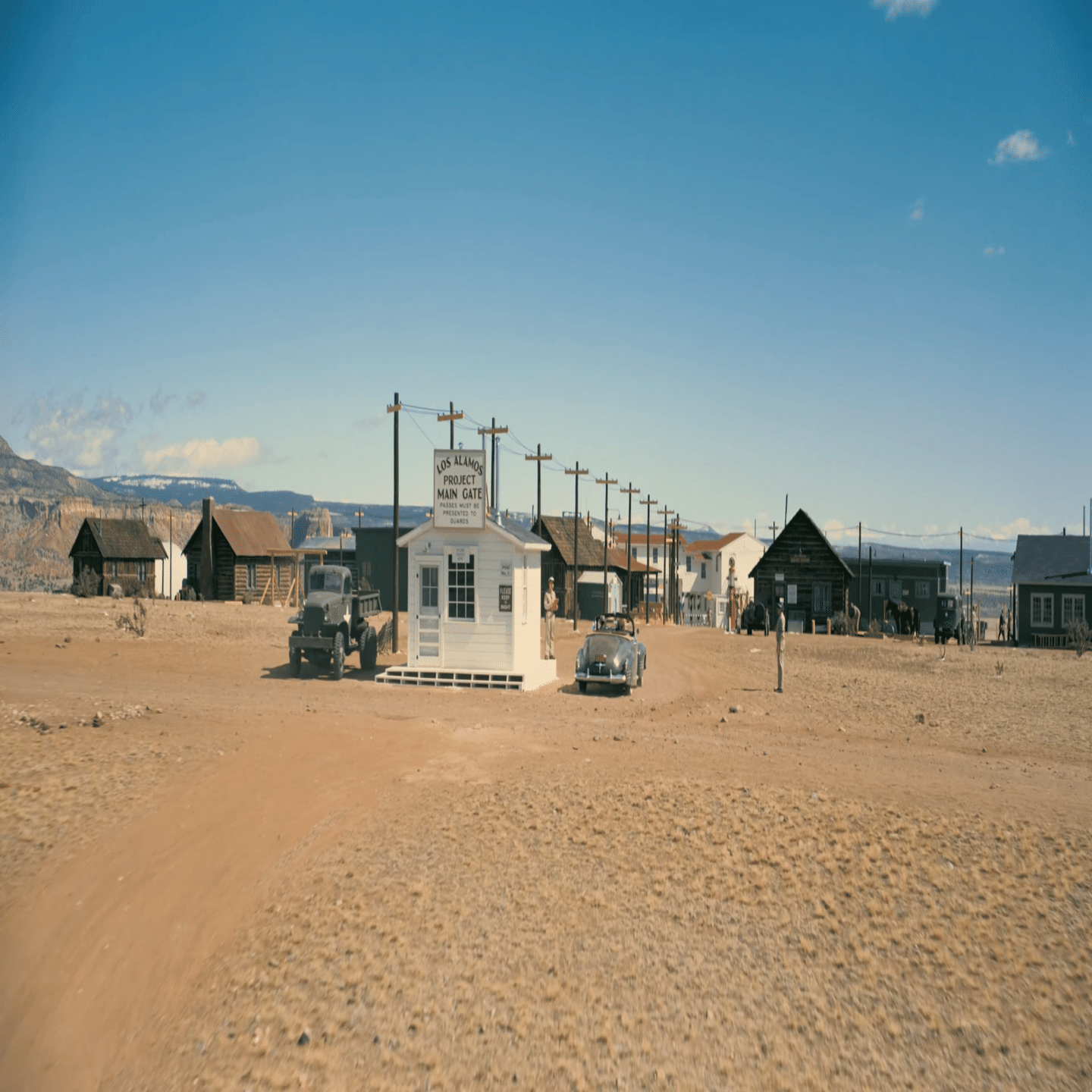 ロス・アラモスでの身辺調査は混迷を極め、グローヴスの部下で駐在していたニコルズ中佐(演デイン・デハーン)は苛立っていた。オッペンハイマーの身元調査はようやく通過したが、一方で共産党団体の運動を続けていたロマンティスが立件されてロス・アラモスから退去を命じられるといった事例もあった。グローヴスはというと、表向きには厳しい態度を取り続けたが、実態では研究者の規則違反を黙認している状態だった。それほど原爆開発は急ぐべき課題だった。