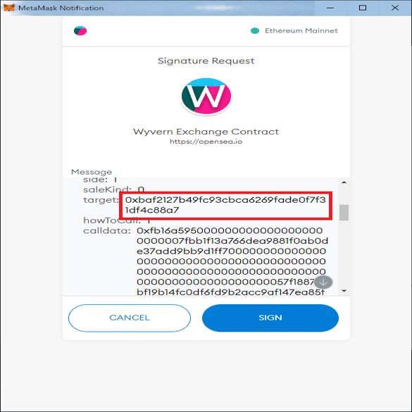 正常なOrderの署名の場合、下記のようにtargetがMerkleValidatorのアドレスとなります。