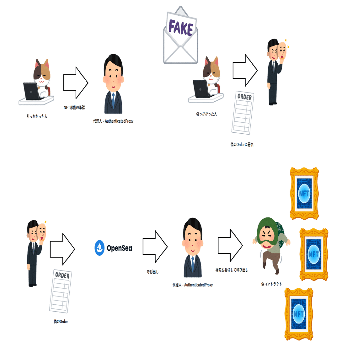 その偽のContractはAthenticatedProxyにsetApproveForAllされているERC721をすべてtrasferFromし、攻撃者のアドレスへ移しました。