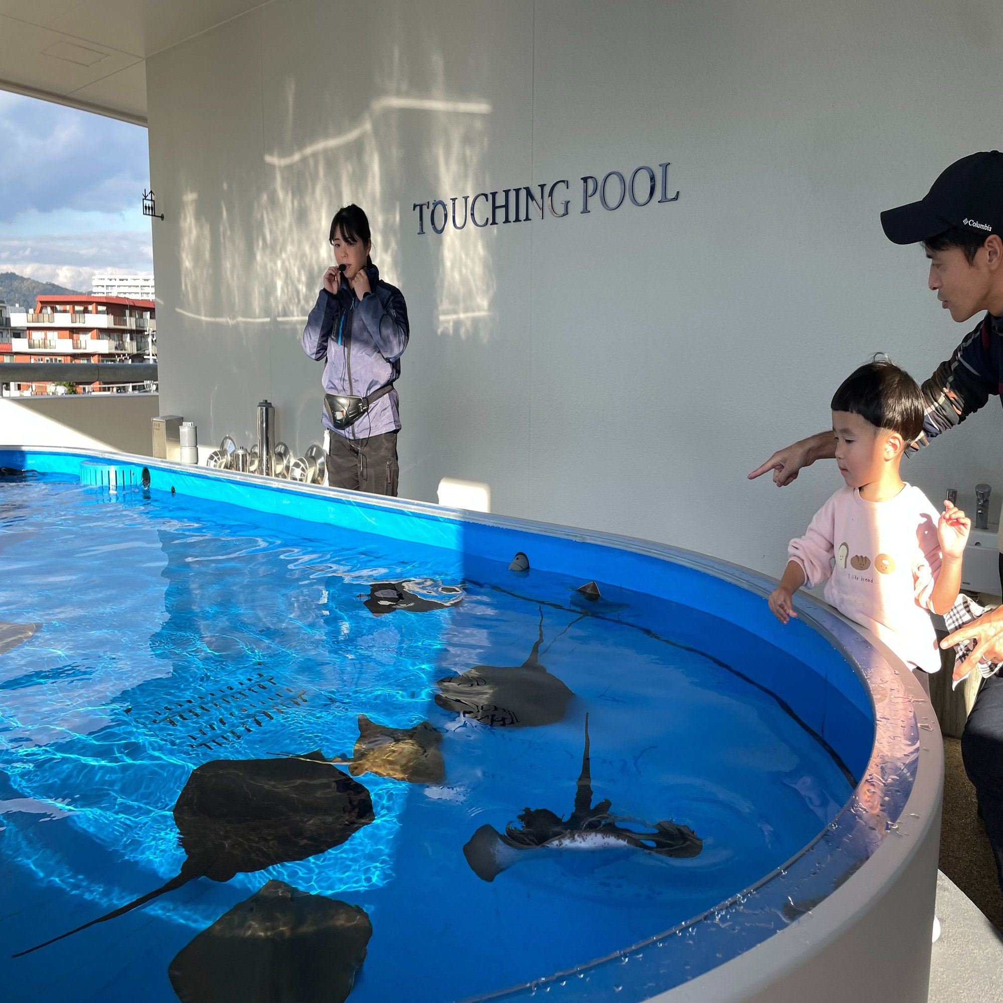 3階には、休憩できるベンチがあるので、アシカやアザラシが優雅に泳ぐ姿を見ながら疲れを癒すことができ、外ではタッチングプールでエイなどをさわることができました。