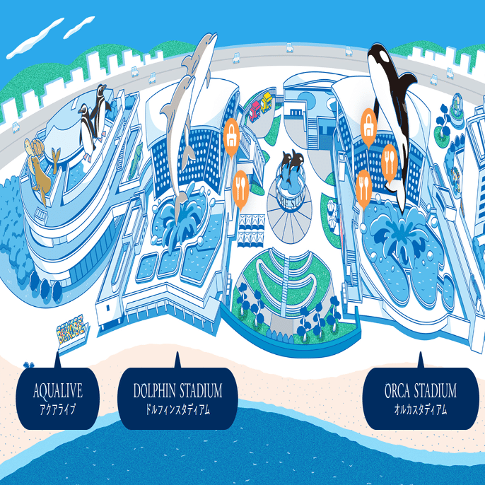 *須磨シーは、「オルカスタディアム」「ドルフィンスタディアム」「アクアライブ」と大きく3つのエリアに分かれています。