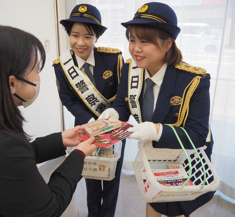 ますみさんは大和高田市出身。警察官の制服姿の2人は署長室で朝山昭彦署長から委嘱状を受け取った後、「年末特別警戒隊」の出発式に臨んだ。その後、ますみさんの母校・市立浮孔(うきあな)小学校で、児童らに自転車に乗る際ヘルメットを着用するよう促すメッセージ入りのクリスマスカードを配った。南都銀行高田支店にも立ち寄り、来店客にチラシや啓発グッズを配って、「特殊詐欺にはくれぐれもお気を付けください」と訴えた。