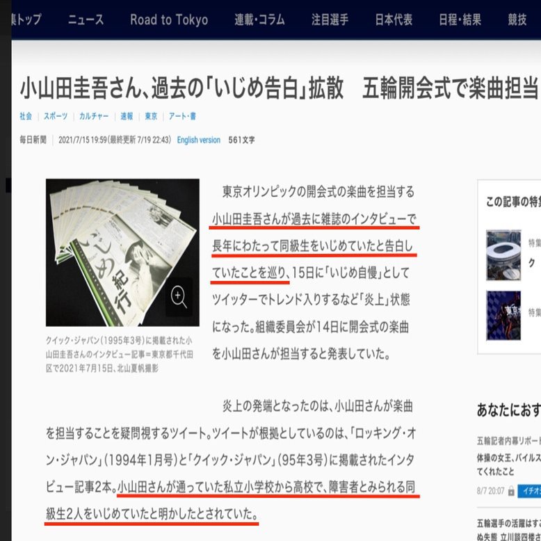 「長年にわたって同級生をいじめていたと告白していた」「小山田さんが通っていた私立小学校から高校で、障害者とみられる同級生2人をいじめていたと明かしたとされていた」
