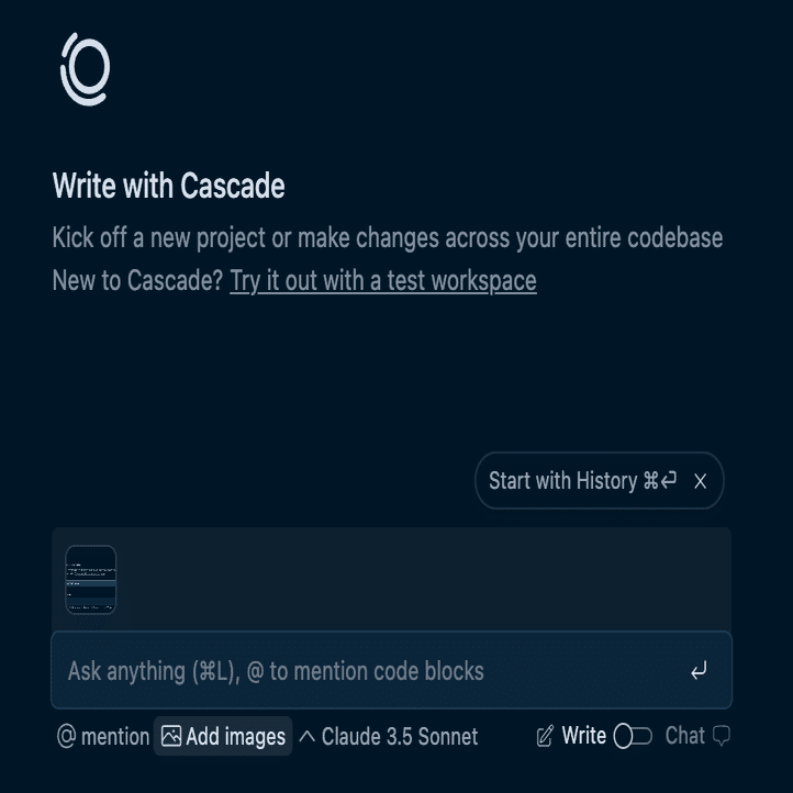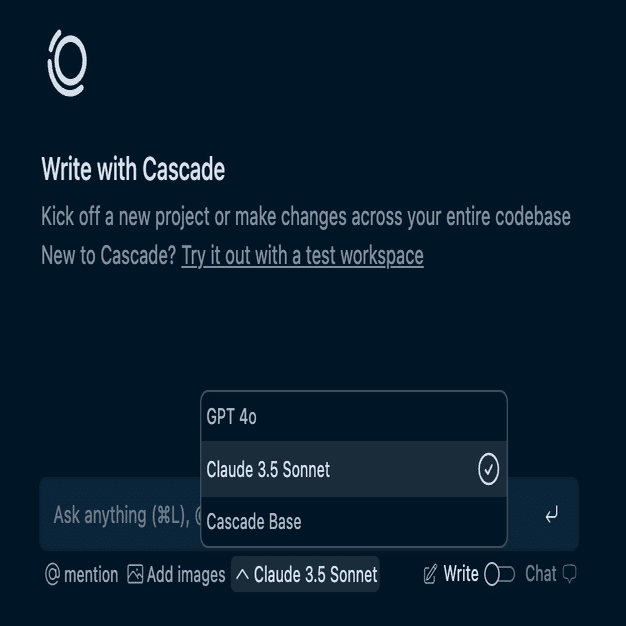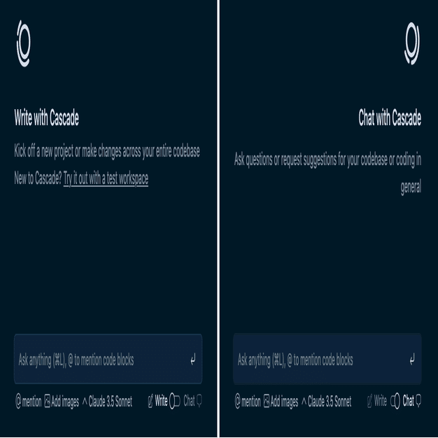 Cascade には、書き込みモードとチャットモードの 2 つのモードがあります。 書き込みモードでは、Cascade がコードベースを作成および変更でき、チャットモードはコードベースや一般的なコーディング原則に関する質問に最適化されています。