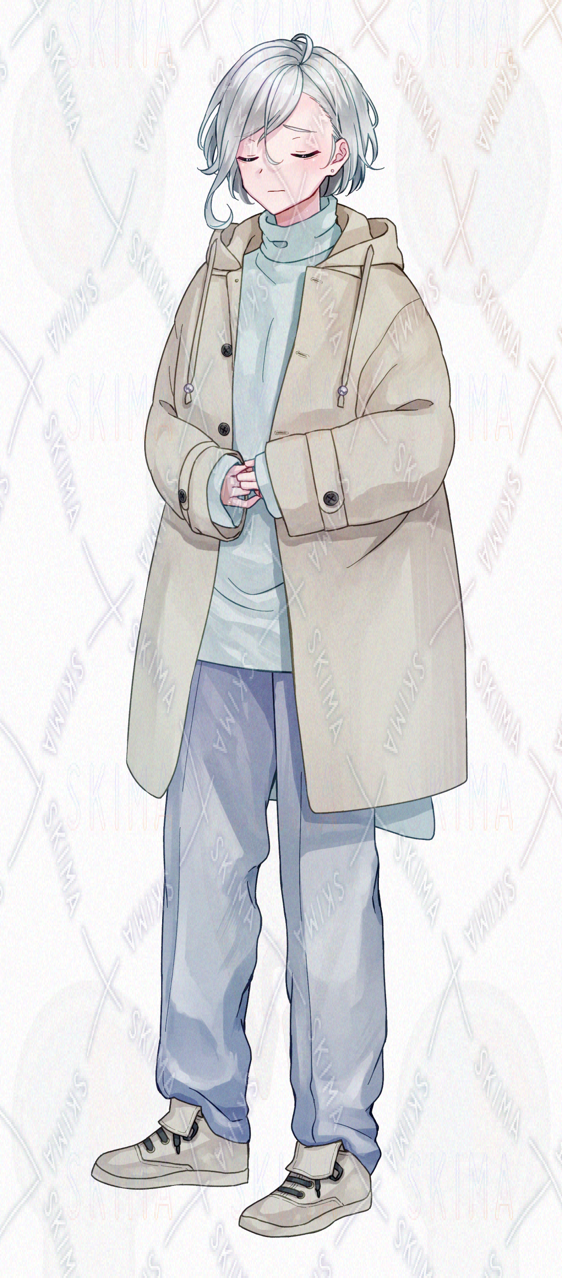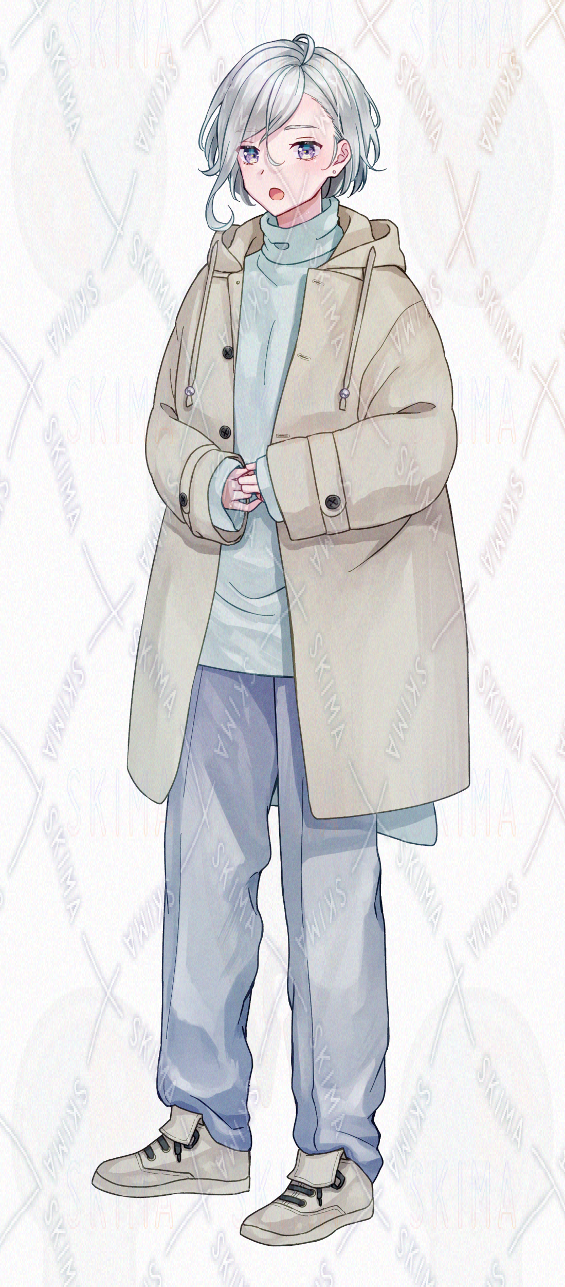 男の子/男子/冬/コート/スニーカー/ベージュ/水色/銀髪/紫眼
