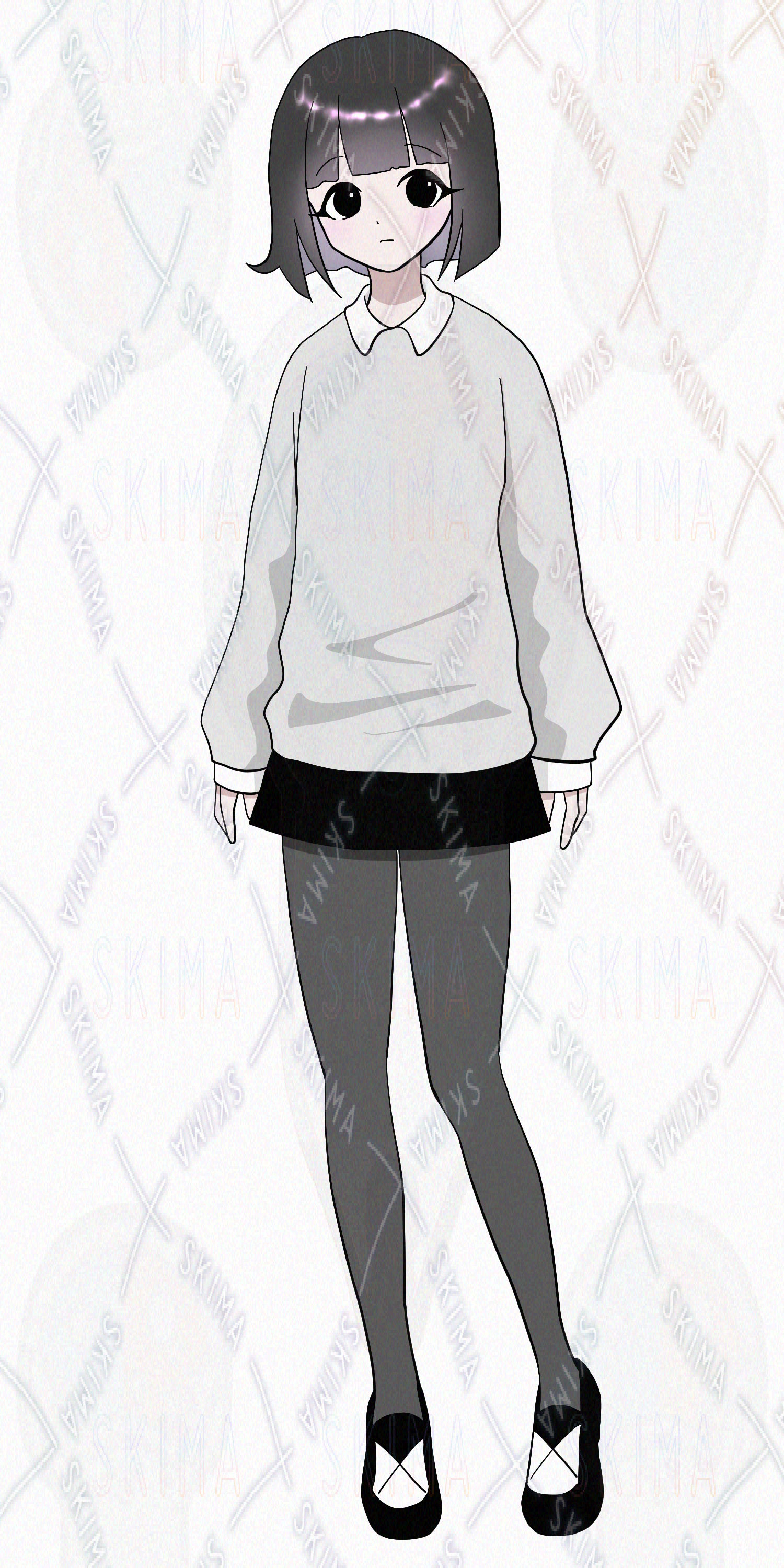 ミニスカート、タイツ、黒髪、ボブカット、モノトーン