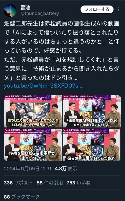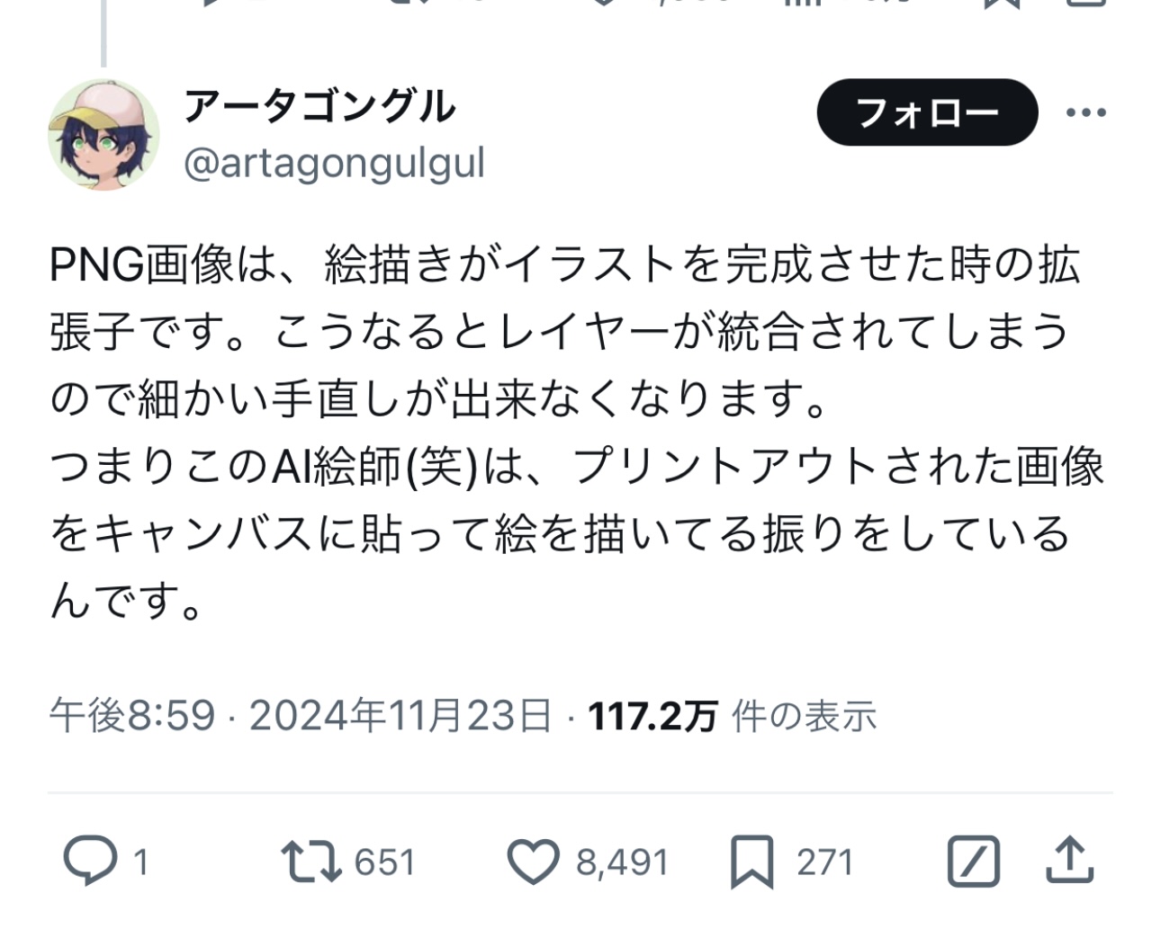 これ言ってるアータゴングルって奴が誹謗中傷で訴えられて引退宣言から即新垢で復帰した反AIなのが一番の笑いどころなんだよね