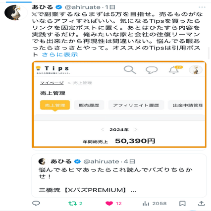 お陰様でアフィでも売れてるよ。購読者はぜひ特典の三橋ポスト推敲コンサル使ってアフィで稼ぎまくってくれ。みんなに実際の威力を体感して欲しい。 pic.twitter.com/rLc0hLbyfG