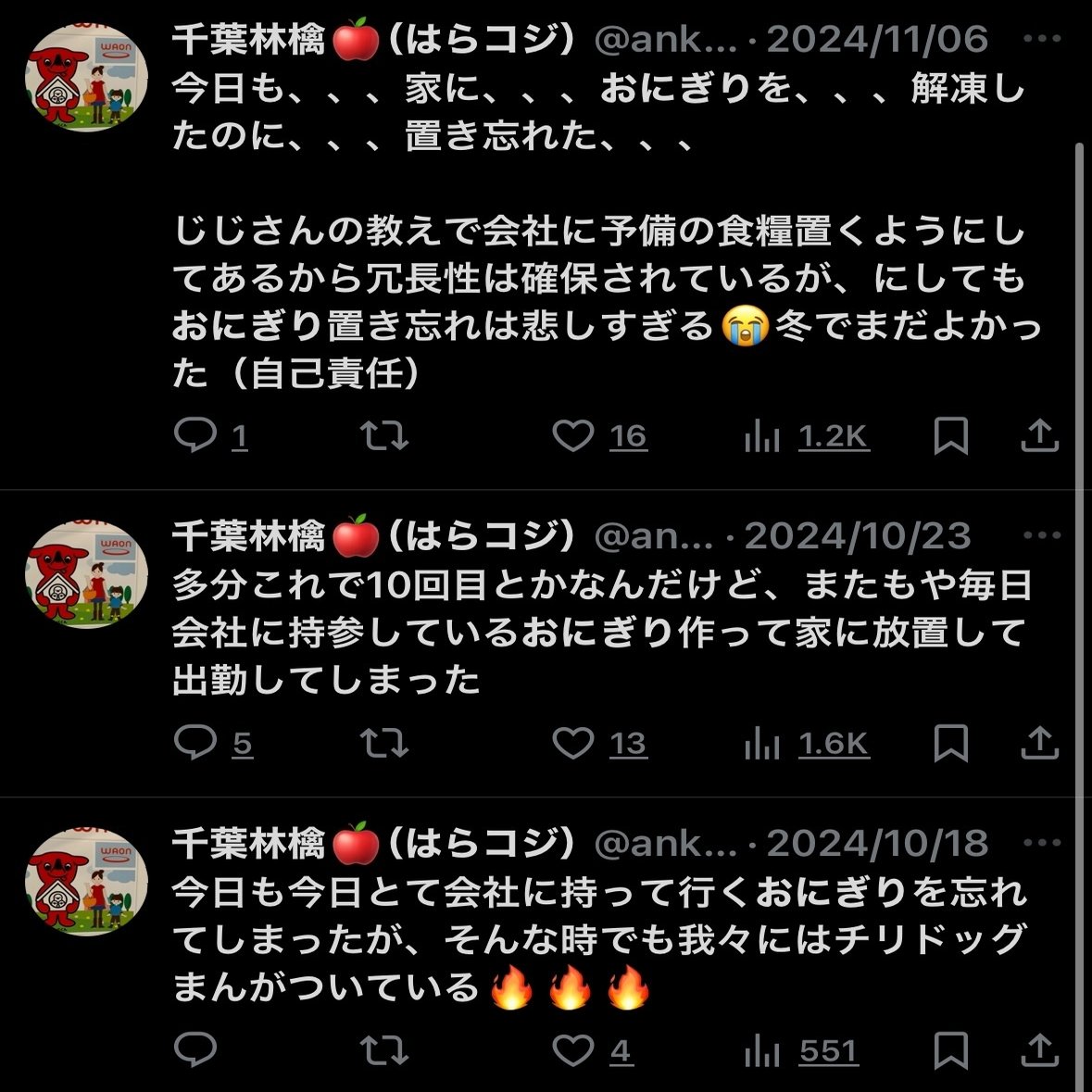 記事に貼るために自身の過去ポストを漁っていたら異様に家におにぎりを置き忘れていることに気づきました。