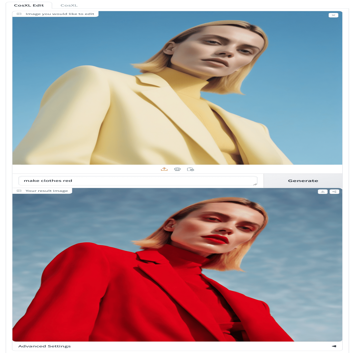 範囲指定などは全くしていません。「make clothes red」というプロンプトを入れただけです。